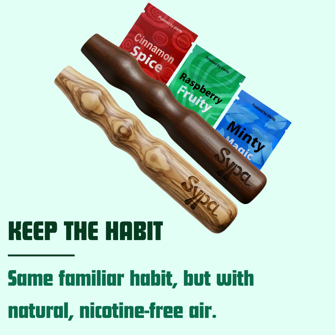Sypa® works by replacing the hand-to-mouth fixation with naturally infused air, offering calming, refreshing flavors without nicotine, smoke, or chemicals. This action helps reduce the psychological need for smoking or vaping while keeping you engaged with familiar habits.