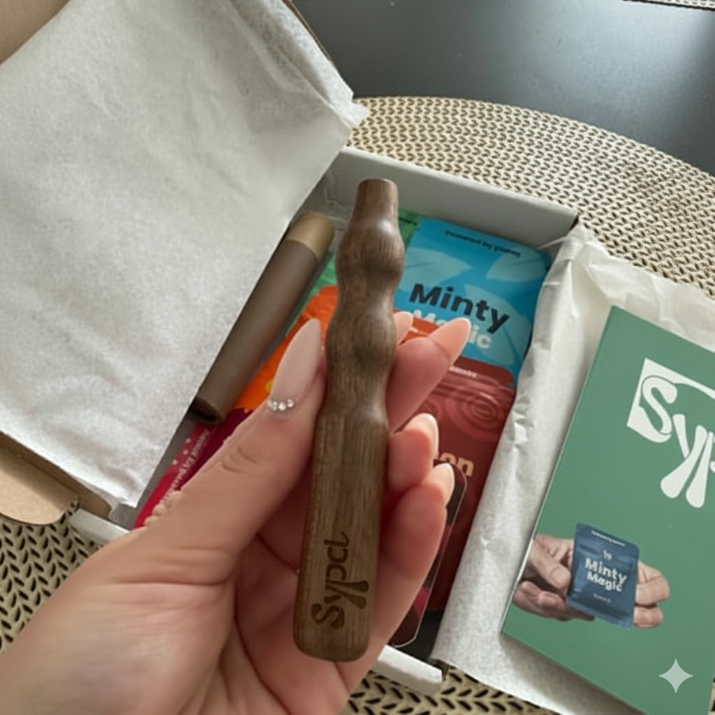 The Sypa is a natural aromatherapy device designed for mindful breathing, stress relief, and cultivating positive habits. It contains small sticks infused with essential oils, which you inhale through the wooden and metal holder to experience a calm, fragrant sensation—anytime, anywhere.